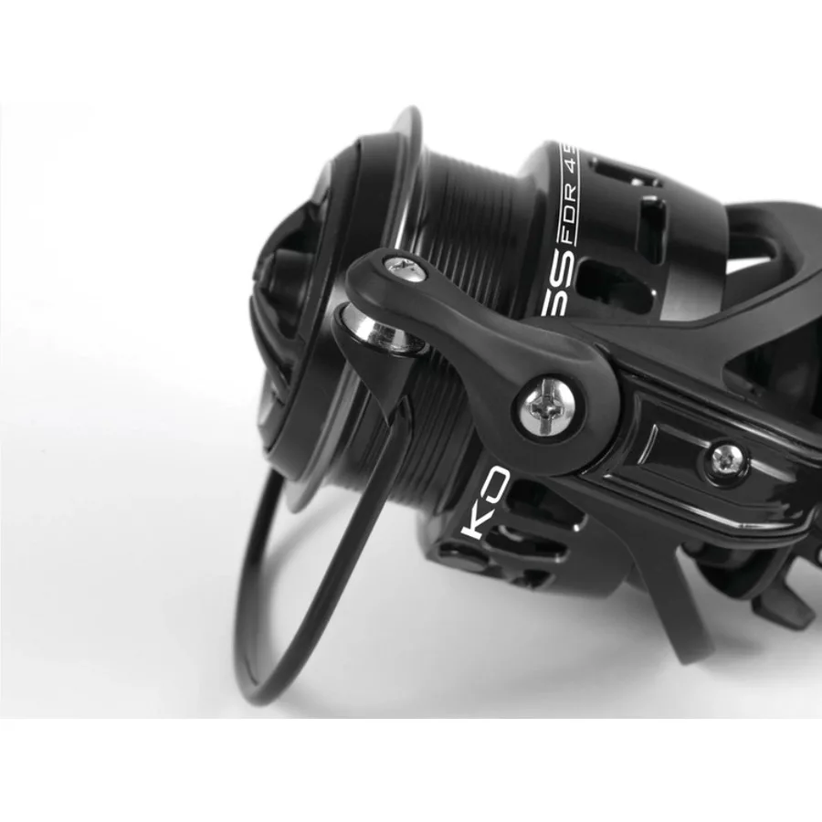 System hamulcowy z ponadwymiarowymi tarczami, który umożliwia bardzo precyzyjną regulację siły hamowania. Duże ramię kabłąka z prowadnicą żyłki z Tytanową powłoką, zapobiegającą skręcaniu się żyłki, oraz korba wykonana w technologii CNC z wygodnym uchwytem.