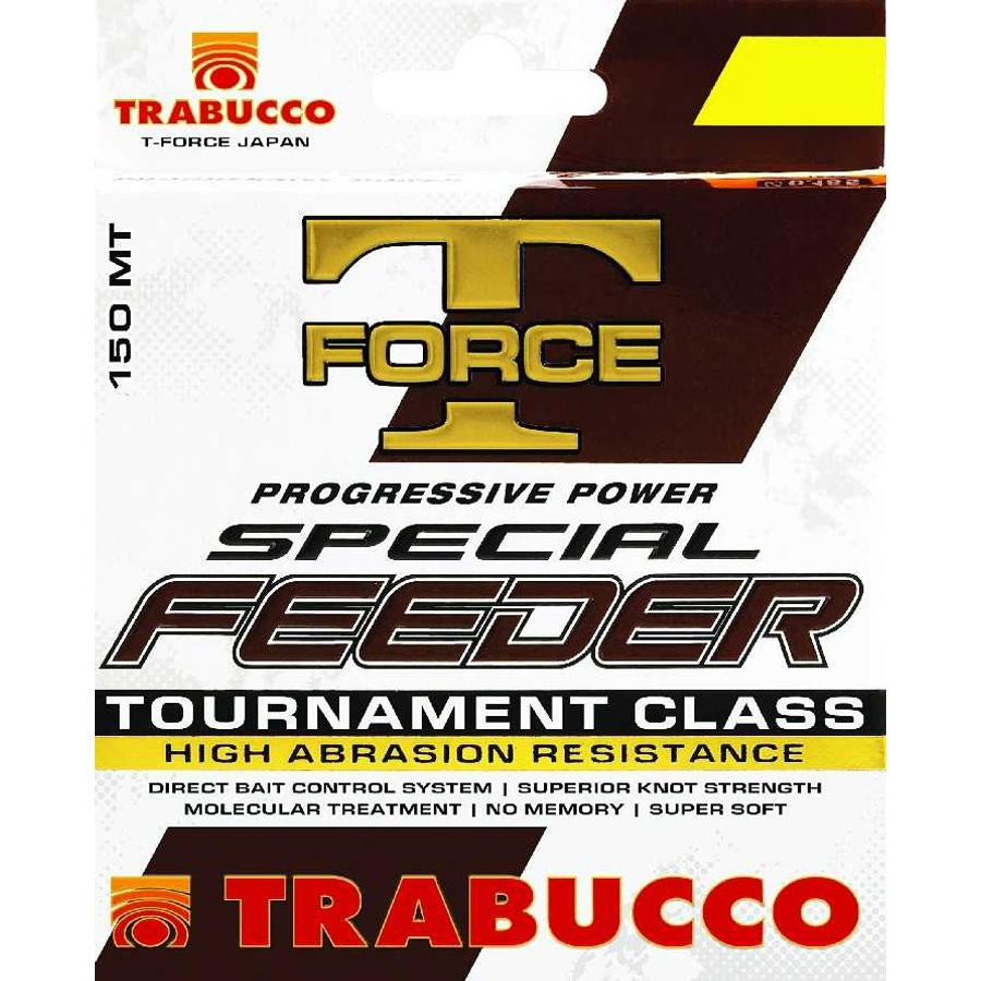 Żyłka monofilowa T-Force Special Feeder, opracowana specjalnie z myślą o potrzebach wędkarzy feederowych. Ta żyłka monofilowa charakteryzuje się ciemnobrązowym kolorem, idealną twardością, szybkim zatapianiem i wysoką odpornością na przetarcia, dlatego ma bardzo długą żywotność. Dzięki niskiej rozciągliwości brania są natychmiast widoczne. Dzięki niej dalekie rzuty można wykonywać precyzyjnie. Oprócz wędkarstwa feederowego, może być również używana do wszystkich metod gruntowych. Dostępna w opakowaniach po sto pięćdziesiąt metrów.