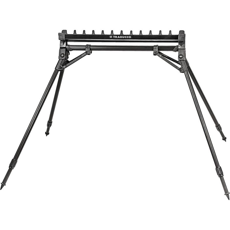 Wysokiej jakości uchwyt na wędkę – z aluminiową ramą – który można rozłożyć i złożyć w mgnieniu oka, dzięki możliwości przesuwania dwóch nóg jednocześnie jednym ruchem. Dzięki teleskopowym nóżkom ustawienie go w odpowiedniej pozycji nie stanowi problemu nawet w najtrudniejszych warunkach terenowych. Przeznaczony do przechowywania 12 wędek. Elementy stykające się z wędką zostały pokryte pianką EVA.