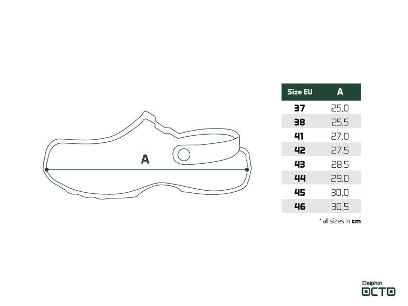 Historia pochodzenia nazwy OCTO jest niezwykle interesująca. Zaprojektowaliśmy ją w stylizowanym kształcie macek ośmiornicy, które zapewniają doskonałą przyцепność w każdych warunkach. Ośmiornica to po angielsku OCTOpus, a po łacinie OCTOpoda, te dwa słowa zainspirowały projekt i nazwę, którą krótko nazwaliśmy OCTO. Kolejnym wyrafinowanym detalem są duże boczne otwory, które służą przede wszystkim wentylacji. Celowo nie są umieszczone na poziomie podeszwy, jak to zwykle bywa, lecz nieco wyżej. Jest to ważne, ponieważ pomaga zapobiec przedostawaniu się piasku lub żwiru między klapkę a podeszwę, zwłaszcza gdy jesteś na brzegu lub w płytkiej wodzie. Dzięki temu Twoje stopy mogą czuć się maksymalnie chronione. Ponadto gęsta perforacja na spodzie również przyczynia się do wentylacji. Po jednej stronie użyliśmy symbolu litery D z logo Delphin, a po drugiej literę O, która jest pierwszą literą nazwy OCTO. Delikatna tekstura na powierzchni podeszwy, przypominająca skórę kałamarnicy, dodatkowo potęguje ogólny efekt. Dzięki materiałowi EVA klapki są niezwykle lekkie, trwałe i unoszą się na wodzie. Oczywiście do modelu dołączony jest również pasek na piętę, który pomaga zabezpieczyć stopę, szczególnie podczas użytkowania na nierównym lub pochyłym terenie.