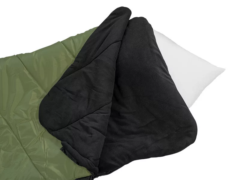 Pikowana warstwa zewnętrzna wykonana jest z wytrzymałego materiału w kolorze zielonym i czarnym. Wewnętrzna warstwa to czarny polar mikropluszowy, który jest niezwykle miękki w dotyku, co pozwala na łatwe odprężenie się. Pomiędzy dwiema warstwami znajduje się ciepła warstwa mikrofibry, zwiększająca zdolność śpiwora do zatrzymywania ciepła, co jest szczególnie ważne w zimnych porach roku. Praktyczną funkcją jest kieszeń zapinana na zamek błyskawiczny pod zagłówkiem, w której można umieścić poduszkę.