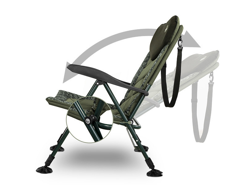 Wysokość nóg krzesła można regulować za pomocą mechanizmu dźwigniowego, dzięki czemu możemy dostosować się do nierówności terenu podczas wędkowania nawet w trudnych warunkach. Położenie krzesła zapewniają również stabilne, obrotowe stopki, które mają dużą powierzchnię, aby nogi nie zapadały się w mokre podłoże nad wodą.