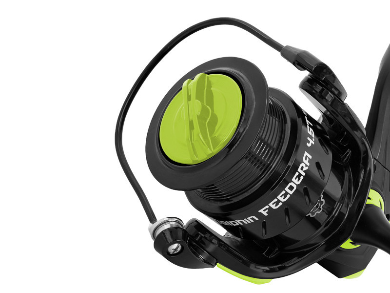 Kołowrotek ma idealny rozmiar 4500 z płytką szpulą, która nadal zapewnia wystarczającą pojemność żyłki do dłuższych rzutów. Posiada siedem (6+1) łożysk kulkowych i przełożenie 5,2:1 dla szybkiego, bezproblemowego nawijania zestawu. Mocny przedni hamulec skutecznie zatrzymuje waleczne ryby. Feedera posiada stopkę ze stali nierdzewnej i gruby metalowy kabłąk dla większej trwałości i lepszej wydajności. Uchwyt ma matowo-czarny kolor i czarną gumową powłokę dla wygodnego chwytu. Hamulec jest mocny i wystarczająco czuły, aby walczyć z rybami, używając delikatnej wędki feederowej. Matowy czarny uchwyt zapewnia wygodny chwyt. Zielone elementy ozdobne nadają kołowrotkowi nowoczesny i sportowy wygląd. Pojemność żyłki mm/m: 0,20/250 m 0,22/210 m 0,24/175 m, Przełożenie: 5,2:1, Liczba łożysk: 6+1, Waga: 314g