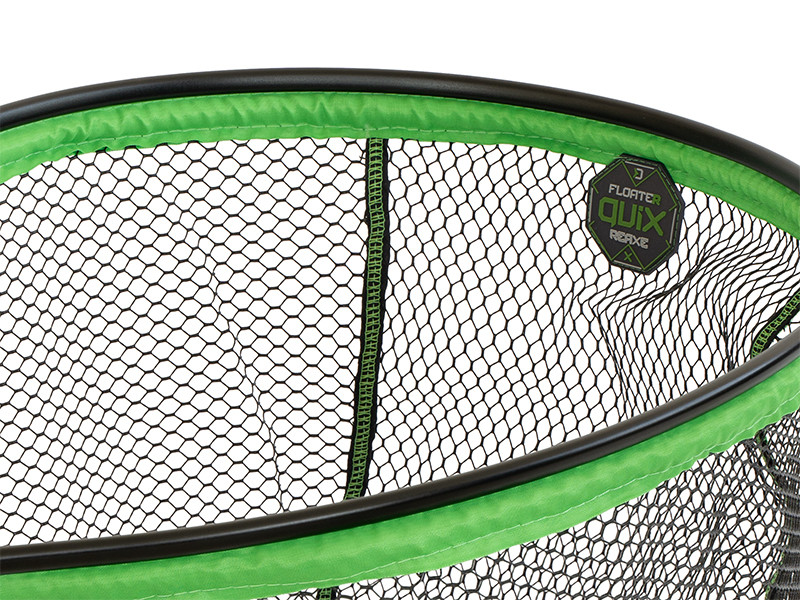 Siatka FloateR Quix jest pokryta gumą, co nie tylko zwiększa jej trwałość, ale także zapobiega wchłanianiu wody, dzięki czemu szybko schnie. Jest to szczególnie korzystne, jeśli chcesz uniknąć niepotrzebnej wilgoci i nieprzyjemnych zapachów. Dolna część ramy jest w całości pokryta zielonym materiałem, co dodatkowo zwiększa trwałość i stylowo pasuje do zielono-czarnej kolorystyki serii Reaxe.