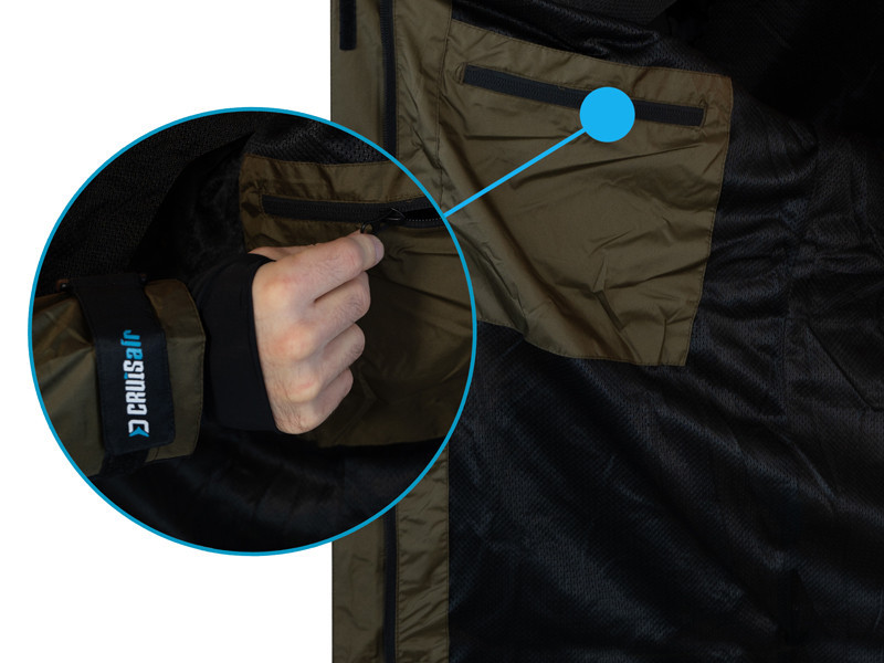 Wewnętrzna strona kurtki jest wyściełana siatkową tkaniną, która nie tylko jest przyjemna w dotyku, ale także zapobiega bezpośredniemu kontaktowi skóry z materiałem zewnętrznym. Dzięki temu komfort noszenia znacznie wzrasta, szczególnie podczas dłuższych wypraw wędkarskich. Wewnętrzna kieszeń zapinana na zamek oferuje praktyczne rozwiązanie do bezpiecznego przechowywania ważnych dokumentów lub drobnych kosztowności. Na zewnątrz kurtki znajdują się dwie wodoodporne kieszenie zapinane na zamek, które niezawodnie chronią zawartość kieszeni przed wnikaniem wody, co jest niezbędne podczas wyprawy wędkarskiej.