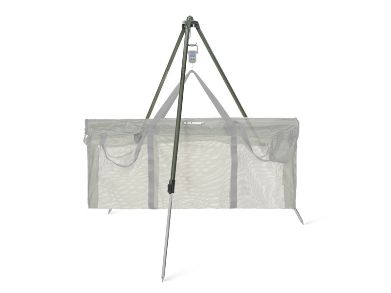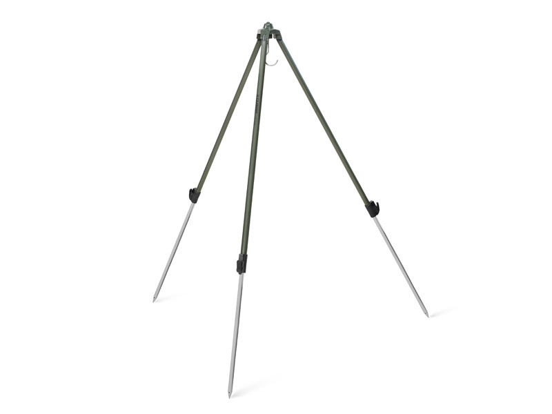 Nogi statywu zbiegają się u góry w centralnym metalowym bloku, na dole którego znajduje się wystarczająco duży i mocny hak, na którym można zawiesić wagę i torbę do ważenia z naszym połowem.