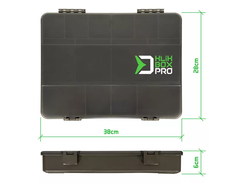 Materiał pudełka to trwałe, odporne na uderzenia tworzywo sztuczne, które wytrzymuje obciążenia nad wodą. Jego wymiary zewnętrzne to 38 x 28 x 6 cm, co oznacza znaczną pojemność wewnętrzną, a jednocześnie jest wystarczająco płaskie i kompaktowe, aby wygodnie zmieścić się w torbie CarryAll lub plecaku wędkarskim. Kompatybilność systemu zwiększa fakt, że idealnie pasuje do pozostałych elementów serii, dzięki czemu pojemność przechowywania można dodatkowo rozszerzyć o osobno dostępne modele KlikBOX Duo i Mini 8.
