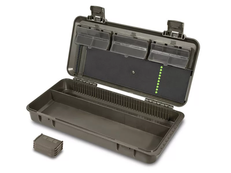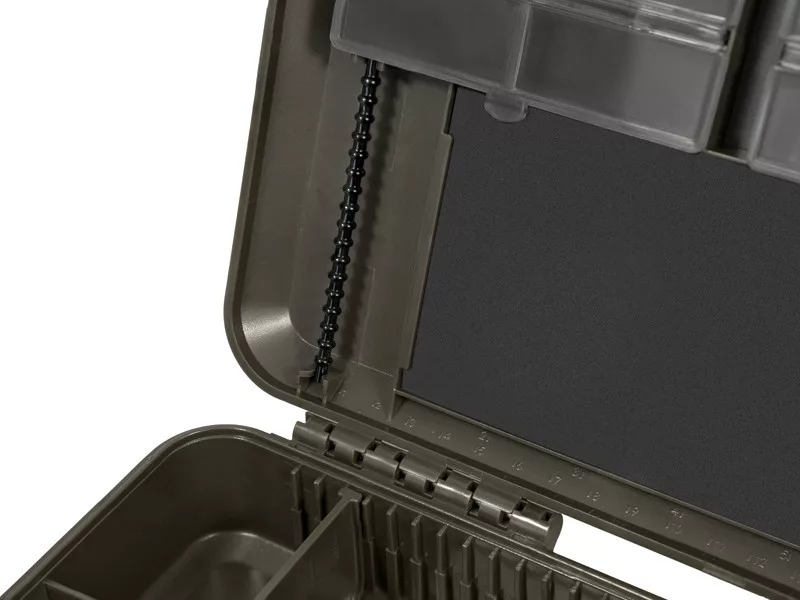 Dolna część pudełka jest podzielona na dwie oddzielne komory. Pierwsza komora zapewnia największą przestrzeń do przechowywania, idealną na ściągacze do węzłów, igły, nożyczki lub inne akcesoria. W tej części bez problemu zmieści się również uchwyt na przypony KlikBOX Rig (nie jest częścią zestawu, można go zakupić oddzielnie). Druga komora posiada regulowane przegródki, dzięki czemu wnętrze można w pełni dostosować do własnych potrzeb, niezależnie od tego, czy chodzi o małe krętliki, agrafki czy inne elementy zestawu końcowego.