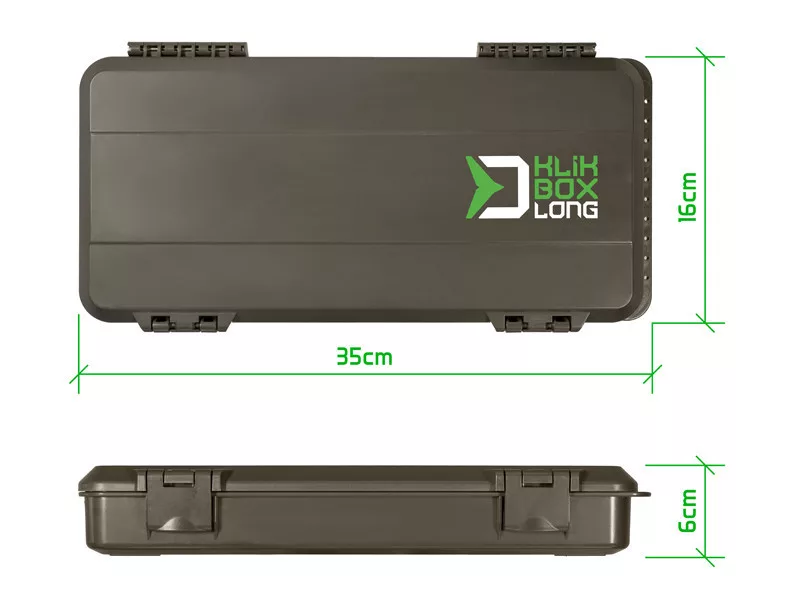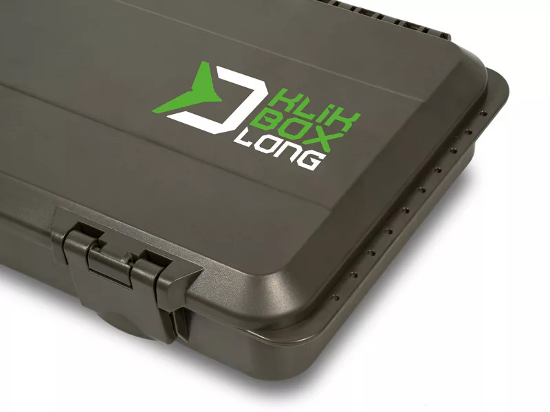 KlikBox Long jest również wyposażony w utwardzoną tackę z pianki i szpilki mocujące, które ułatwiają mocowanie zestawów końcowych. Na całej długości części do przechowywania przyponów znajduje się miarka, która pomaga w precyzyjnym określeniu długości zestawów. Pudełko wykonane jest z niezwykle wytrzymałego tworzywa sztucznego, a dwie mocne plastikowe klamry zapewniają wygodne i bezpieczne otwieranie i zamykanie. Opakowanie zawiera 10 sztuk szpilek mocujących.