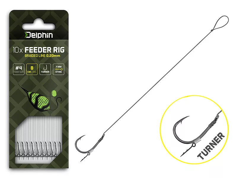 Zawartość opakowania__38__:Delphin Braided Sting Feeder Rig 8cm Plecionka z przyponem 4 Turner Haki 10szt