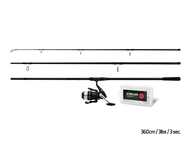 Centralnym elementem zestawu jest trzyczęściowa wędka karpiowa Yakuza o długości 360 cm i mocy 3 lbs, która dzięki akcji parabolicznej sprawia, że holowanie mniejszych karpi lub innych gatunków ryb jest przyjemnością, a jednocześnie posiada wystarczającą rezerwę mocy do kapitałowych połowów i precyzyjnych rzutów. Materiał wędki to kompozytowe włókno szklane i mieszanka karbonu, co zapewnia odpowiednią elastyczność, trwałość i długą żywotność, dzięki czemu jest idealnym wyborem do regularnego wędkowania.
