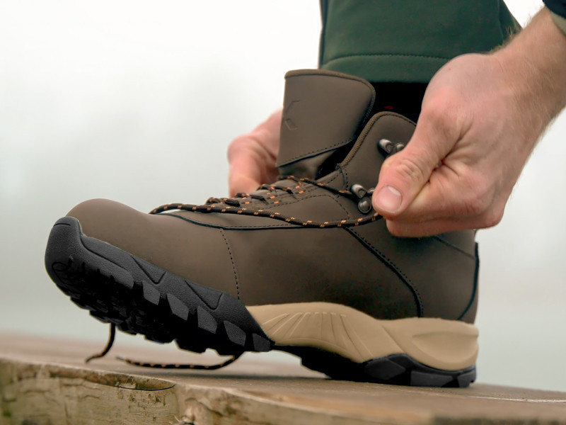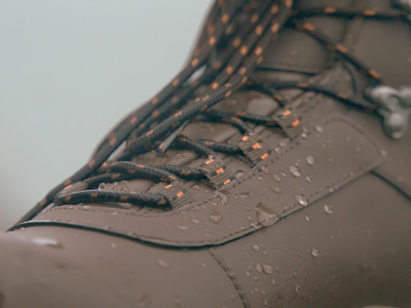 Cholewka butów wykonana jest z wysokiej jakości skóry bydlęcej, znanej z naturalnej odporności na ścieranie i długiej żywotności. Skóra została poddana obróbce wodoodporną powłoką, dzięki czemu obuwie zachowuje swoje właściwości hydrofobowe nawet w niesprzyjających warunkach pogodowych. Jest to szczególnie korzystne podczas wędkowania, kiedy mokra trawa, zroszony brzeg lub śliskie podłoże po deszczu mogą stanowić codzienne wyzwanie. Wodoodporna skóra i wewnętrzna skarpeta membranowa wspólnie dbają o to, aby stopa pozostała sucha i komfortowa.