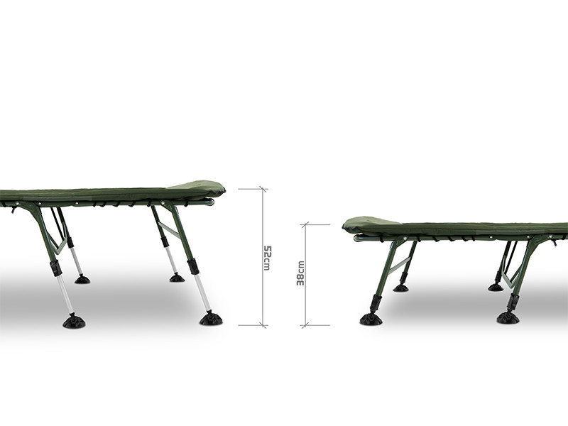Łóżko wędkarskie Delphin ErgoCARP reprezentuje nowy poziom wypoczynku nad wodą, gdzie spotykają się komfort, stabilność i trwałość. Zwiększony rozmiar materaca (215 × 80 cm) zapewnia wystarczająco dużo miejsca nawet dla wyższych wędkarzy, podczas gdy wysokość podstawy 38 cm i teleskopowe nogi regulowane do 52 cm sprawiają, że łóżko można stabilnie ustawić w każdym terenie. Osiem niezależnie regulowanych nóg wyposażono w szerokie, elastyczne stopki, które zapobiegają zapadaniu się w miękkim podłożu i zapewniają stabilność na nierównych powierzchniach.