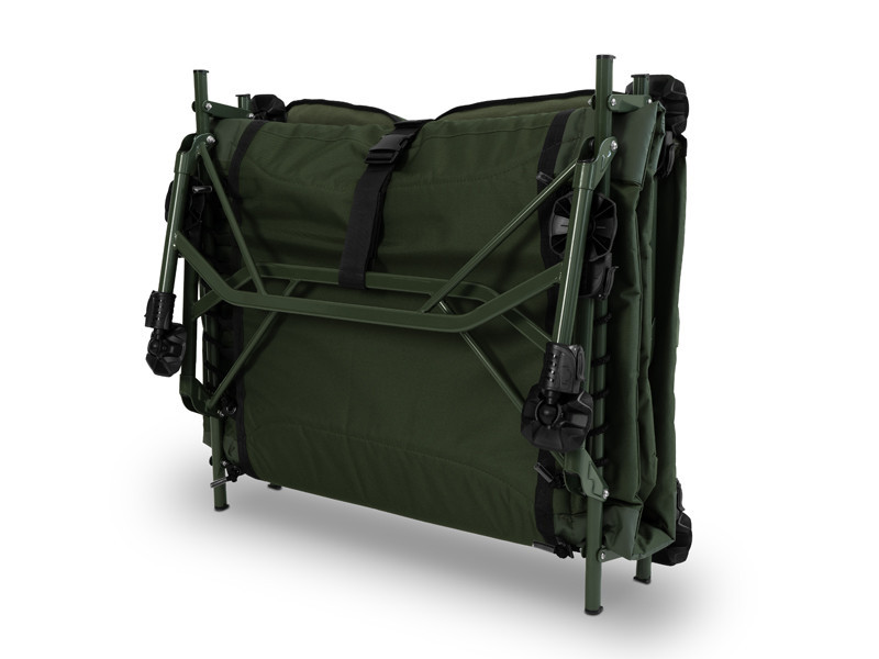 Łóżko wędkarskie można otworzyć i złożyć w ciągu kilku sekund, dzięki czemu jest szybkie i łatwe w użyciu. Bezpieczny transport ułatwiają odpinane, regulowane wzdłużnie paski, które zapinane są na solidne plastikowe klamry – te zapobiegają przypadkowemu otwarciu podczas transportu.