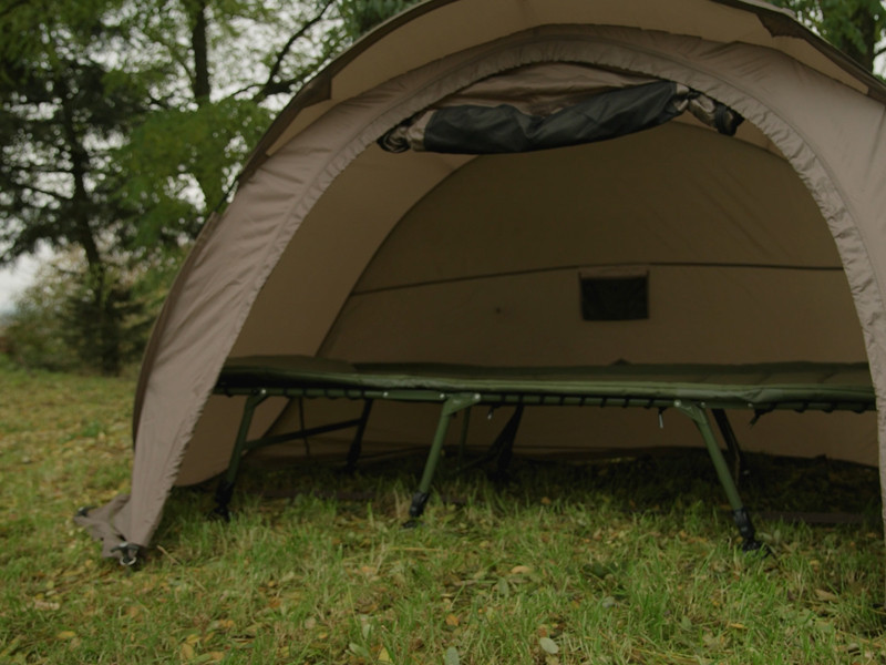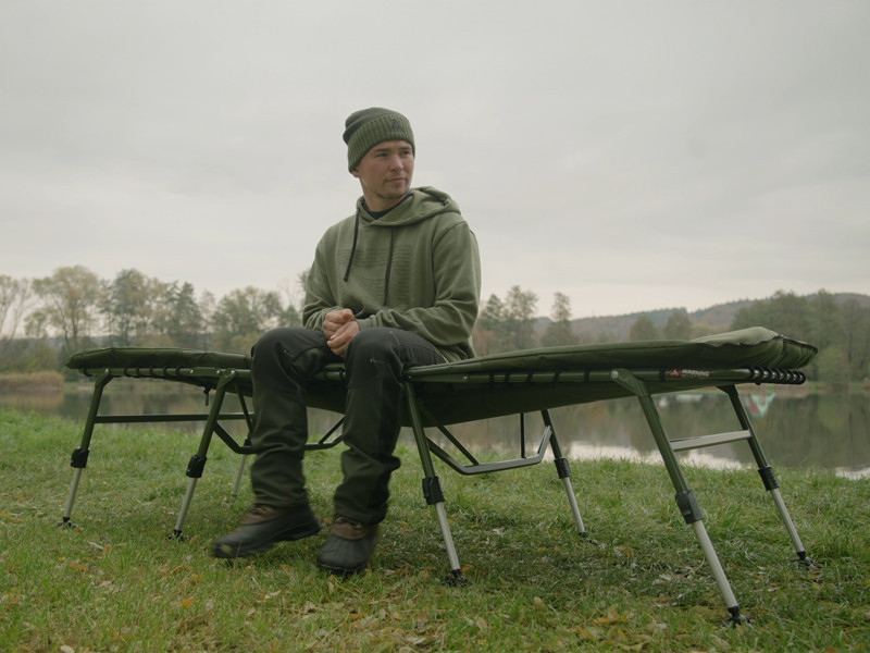 Łóżko wędkarskie zbudowano na mocnej, wytrzymałej metalowej konstrukcji, która jest odporna na intensywne użytkowanie, a jednocześnie lekka i łatwa do przenoszenia. Mechanizm blokujący parę nóg przy zagłówku zapobiega niepożądanemu złożeniu, umożliwiając bezpieczne i szybkie rozłożenie. Cała powierzchnia materaca pokryta jest miękkim polarem, który jest przyjemny w dotyku i zapewnia ciepło w chłodne noce. Krawędź chroniona jest wytrzymałym, oliwkowozielonym materiałem 600D, który jest odporny na ścieranie i gwarantuje długą żywotność.
