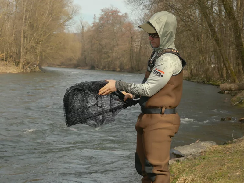 Rączka i rama wykonane są z trwałego metalu, co gwarantuje wysoką wytrzymałość i długą żywotność. Konstrukcja pozostaje jednak lekka, dzięki czemu nie obciąża użytkownika nawet podczas dłuższych dni wędkarskich. Rama jest wyposażona w gumowaną siatkę, która nie wchłania wody, co ogranicza powstawanie nieprzyjemnych zapachów. Dzięki gumowanej powłoce haczyki przynęt sztucznych łatwiej się uwalniają, co jest szczególnie korzystne podczas spinningu. Odpowiednia głębokość siatki zapewnia, że nawet większe ryby pozostają bezpiecznie w podbieraku, nie wyskakując.