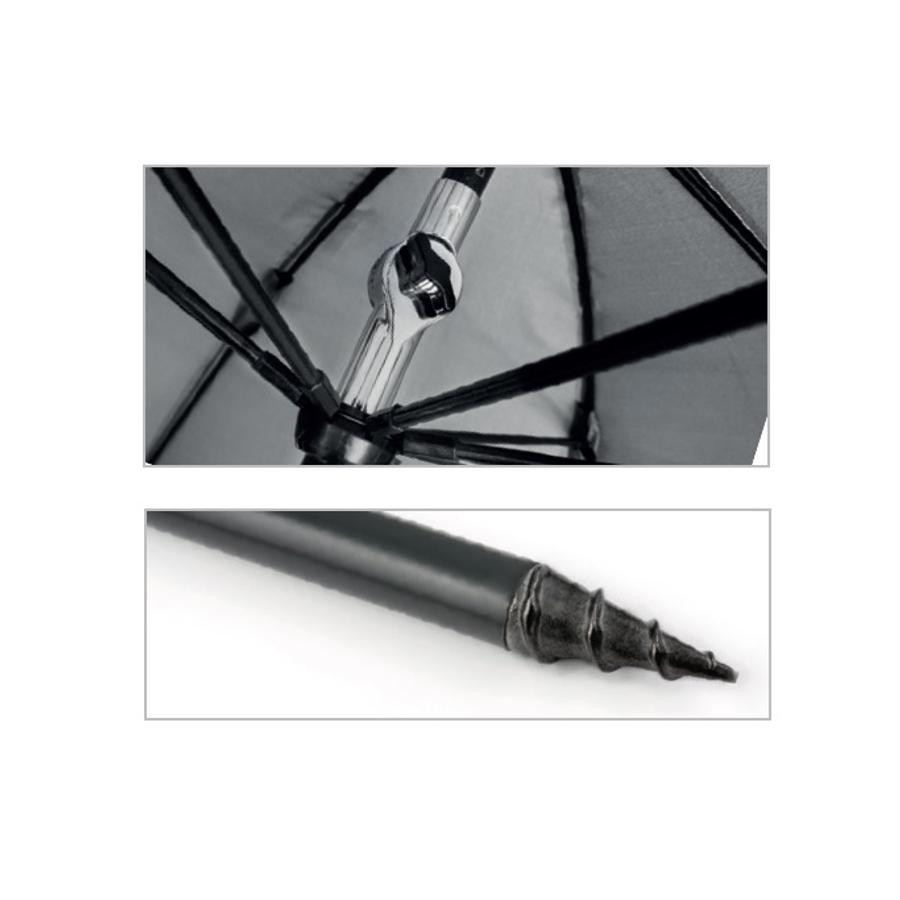Dzięki spawanych szwom parasol jest w pełni wodoodporny, zapewniając niezawodną ochronę nawet podczas lekkiego deszczu. Wzmocniony mechanizm mocowania i regulacji kąta pozwala na ustawienie parasola pod żądanym kątem nachylenia i stabilne przymocowanie go do ziemi. Dołączone pierścienie, szpilki mocujące i liny zapewniają, że parasol pozostanie na swoim miejscu nawet w ekstremalnych warunkach pogodowych. Dzięki zastosowaniu lekkich materiałów zamiast stali, parasol jest łatwy do przenoszenia, jednocześnie nie trzeba iść na żadne kompromisy w kwestii trwałości czy niezawodności.