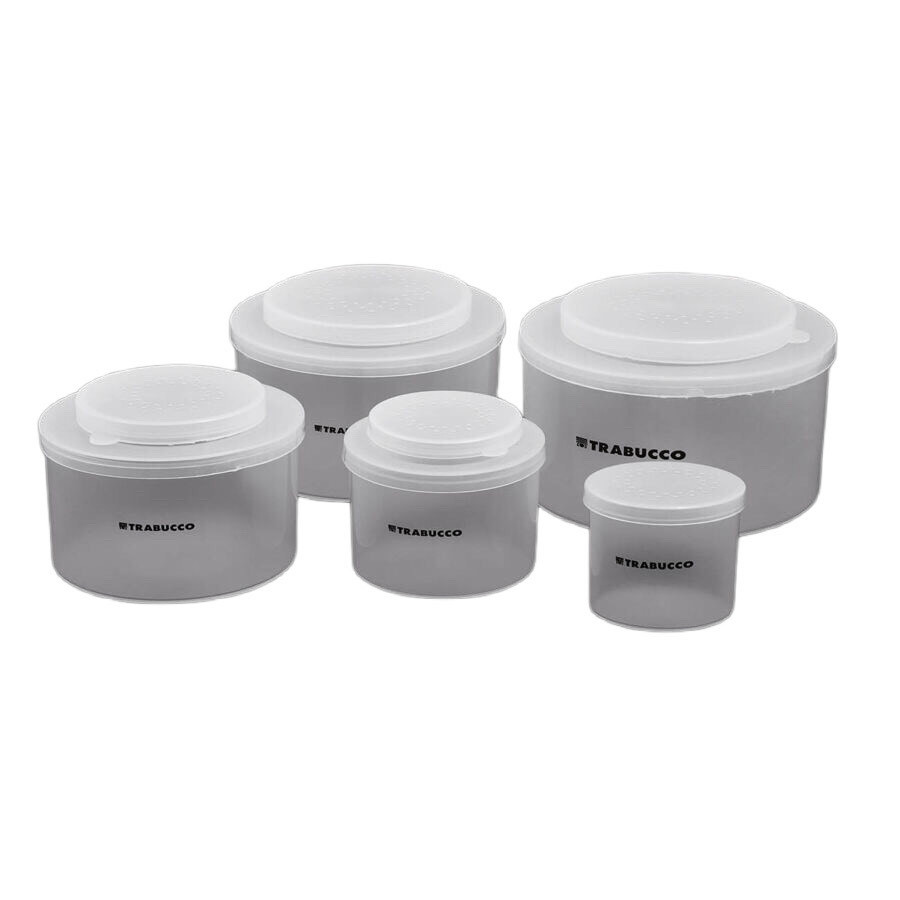 Zestaw pudełek na przynęty, składający się z pięciu zamykanych pudełek. Perforowane pokrywki zapewniają odpowiednią wentylację przynęty. Dodatkową cechą jest to, że środek pokrywki jest również otwierany (z wyjątkiem najmniejszego pudełka), dzięki czemu znajdujące się w środku larwy, dżdżownice itp. nie mogą się wydostać, a całą pokrywkę można również zdjąć. Przechowywanie jest bardzo proste, wszystkie inne mieszczą się w największym.