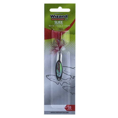 Błystka wahadłowa Wizard Slice z haczykiem muchowym - Przynęta ma specjalny, ścięty z boku kształt, doskonale imitujący zranioną rybę. Prowadzenie jej jest identyczne jak w przypadku innych wahadłówek, ciągłe w wolnym tempie, ale można ją również stosować z efektem opadającego liścia, zatrzymując i ruszając, przez co staje się przede wszystkim ofiarą szczupaków. Prowadzona ciągle, a nawet szybko, jest również doskonałą opcją do podchodów na bolenie.