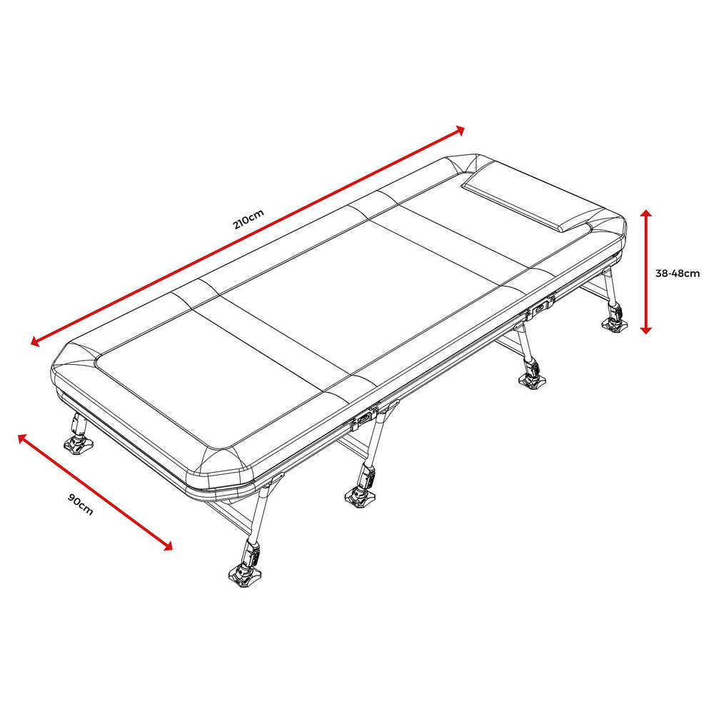 Precyzyjnie obrobione aluminiowe zawiasy zapewniają stabilność i trwałość łóżka. Z wodoodporną tkaniną EX o wodoodporności 20 000 mm. Dzięki wodoodpornej tkaninie EX górna część łóżka skutecznie chroni przed silnymi opadami deszczu. Ulepszony system nóg LevelTech zapewnia równą powierzchnię spania i stabilnie utrzymuje łóżko. Drewniana konstrukcja TLS pomaga materacowi być całkowicie płaskim, zwiększając tym samym komfort. Luksusowy materac z pianki pamięciowej zapewnia doskonałe podparcie i komfort nawet podczas długich sesji wędkarskich. Wodoodporna górna część Heavy Duty EX zapewnia dodatkową ochronę łóżka. Dwuwarstwowa odwracalna kołdra zwiększa higienę i komfort.