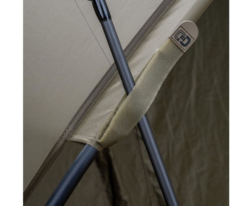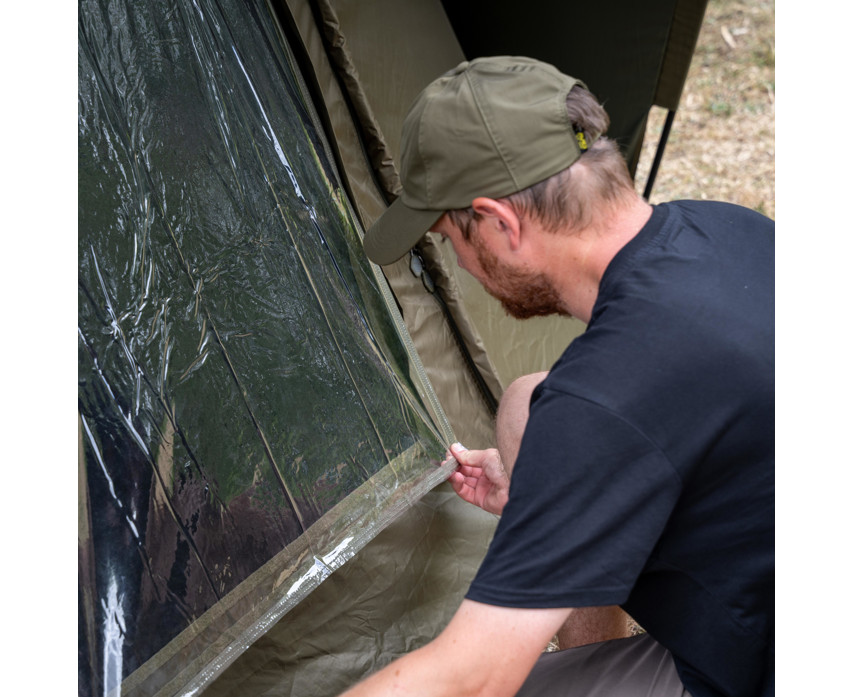 A sátor elején két praktikus bottartó pánt található, amelyek segítenek a horgászbotok biztonságos és rendezett tárolásában. A csomag tartalmaz egy könnyű aljzatot, masszív leszúrókarókat és támasztórudakat, valamint egy nagy méretű, cipzáros hordtáskát, amely megkönnyíti a szállítást és tárolást.