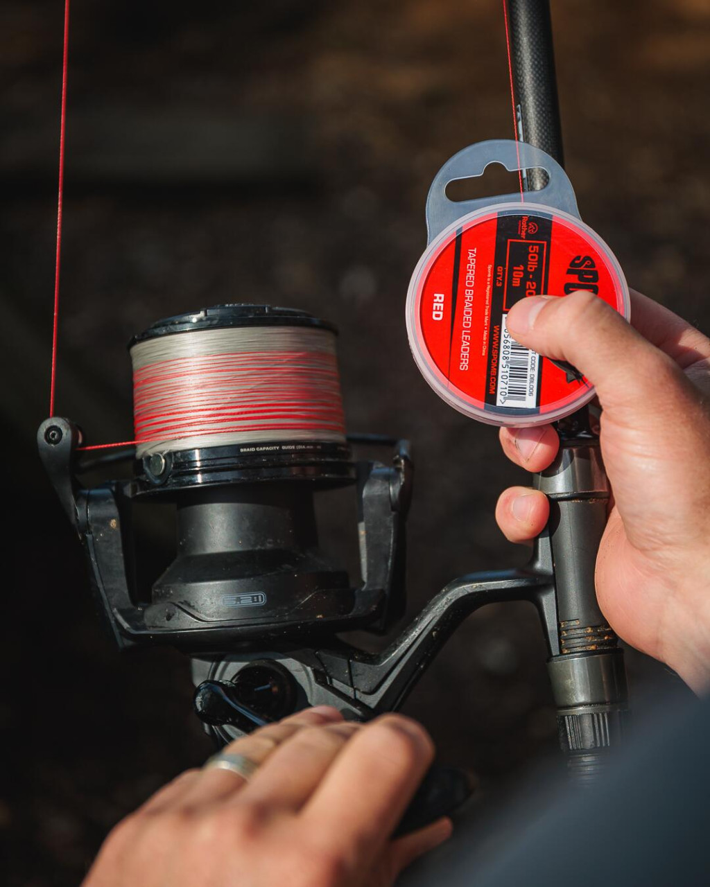 Spomb Tapered Braided Leaders to specjalnie zaprojektowana, stożkowa plecionka rzutowa, opracowana z myślą o wędkarstwie na duże odległości i nęceniu rakietą zanętową (Spomb). Żyłka stopniowo zwęża się z grubości 0,38 mm (50 lb) do 0,20 mm (20 lb), zapewniając płynne przejście między przyponem rzutowym a żyłką główną. To rozwiązanie znacznie poprawia efektywność i bezpieczeństwo rzutów.