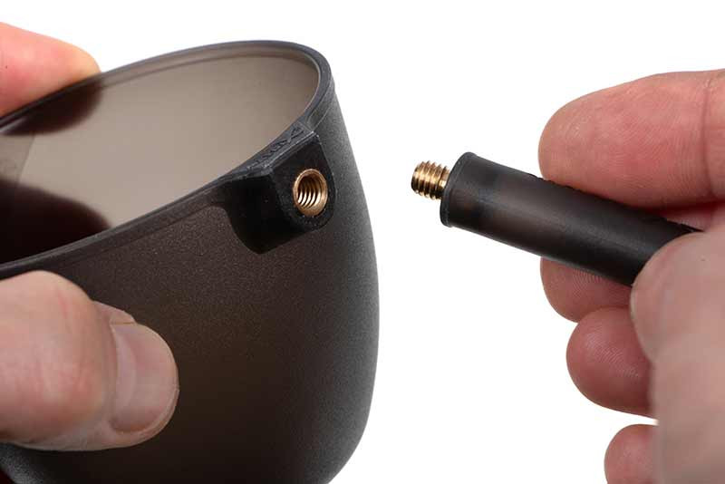 Zaprojektowany do podawania dużych ilości zanęty. Dwa rozmiary kubków: 150 ml i 250 ml. Odlane z lekkiego, trwałego tworzywa sztucznego. Wzmocniony gwint mosiężny. Wkład gwintowany można zamontować wewnętrznie (7 mm) lub zewnętrznie (5 mm).