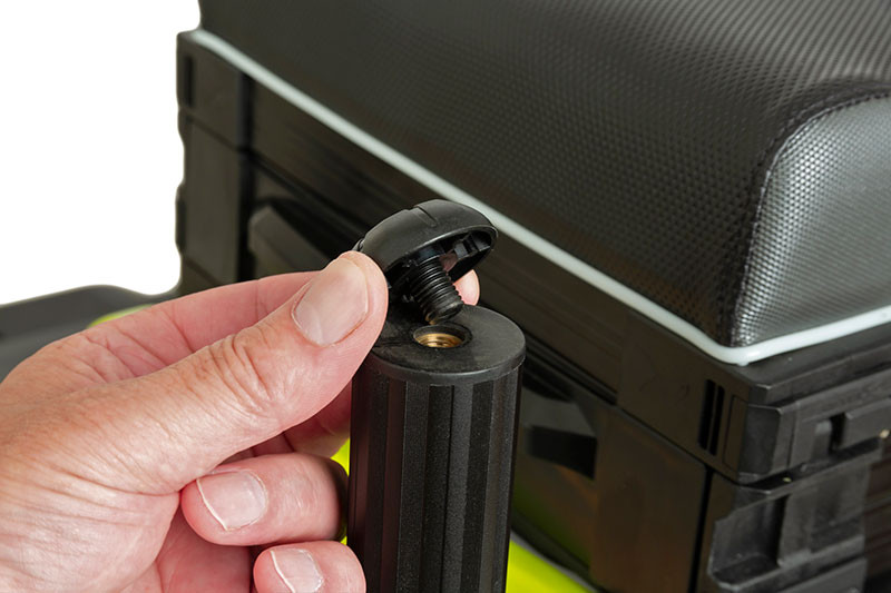 The box frame is made from a single piece of Hydro formed aluminum, which is extremely durable and long-lasting. This solution guarantees that it can withstand even the greatest demands, while remaining lightweight and practical. The footplate has a textured plastic covering, which not only makes it durable but also helps with precise adjustment thanks to a built-in spirit level. The anodized, 36 mm extendable legs are non-slip, and the threaded leg ends allow for the attachment of additional accessories. The redesigned leg locks leave no marks while providing maximum stability, and the storage units with spring-loaded pins provide quick and easy access to equipment.