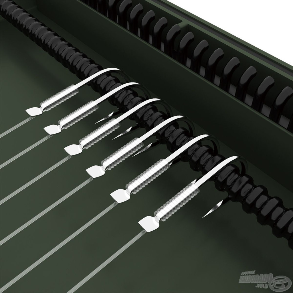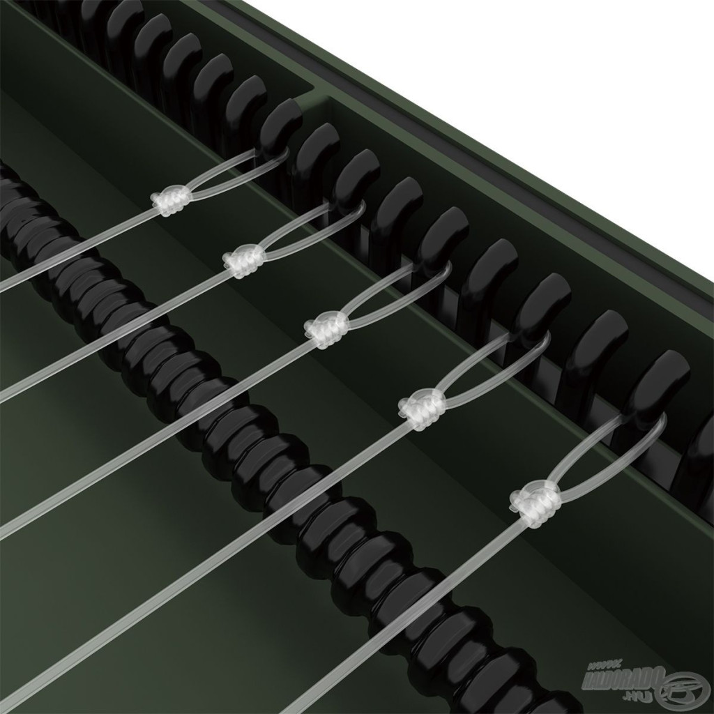 Wewnętrzna konstrukcja pudełka umożliwia precyzyjne mocowanie przyponów: oczko przyponu haczykowego należy zaczepić o haczyk umieszczony po jednej stronie, natomiast haczyk można bezpiecznie wbić w ultra mocną piankę EVA. To rozwiązanie nie tylko mocuje, ale także chroni przypony, zapobiegając ich splątaniu, deformacji czy uszkodzeniu. Carp Rigs Box to doskonały wybór do dłuższych przyponów karpiowych, gdzie szczególnie ważna jest precyzyjne ułożenie i zachowanie stanu zestawów.