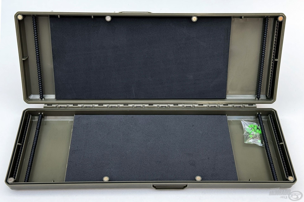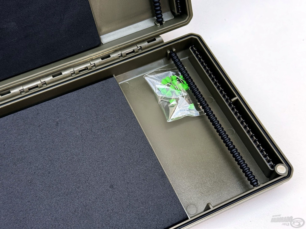 Wymiary 330 x 125 x 38 mm umożliwiają wygodne przechowywanie dłuższych przyponów, a jednocześnie pudełko nadal dobrze mieści się w przeciętnej torbie wędkarskiej. Zielony kolor i wzór plastra miodu na pokrywie nadają pudełku nowoczesny wygląd, a trwałość nie cierpi na tym.
