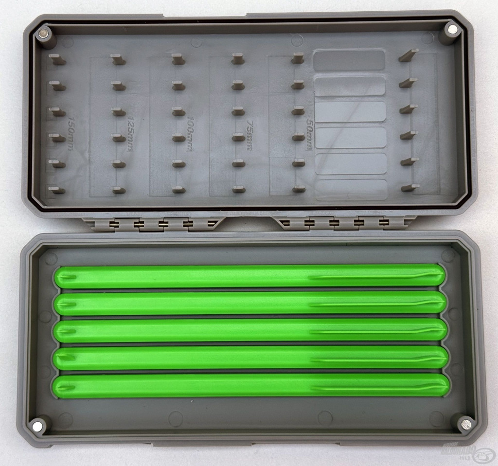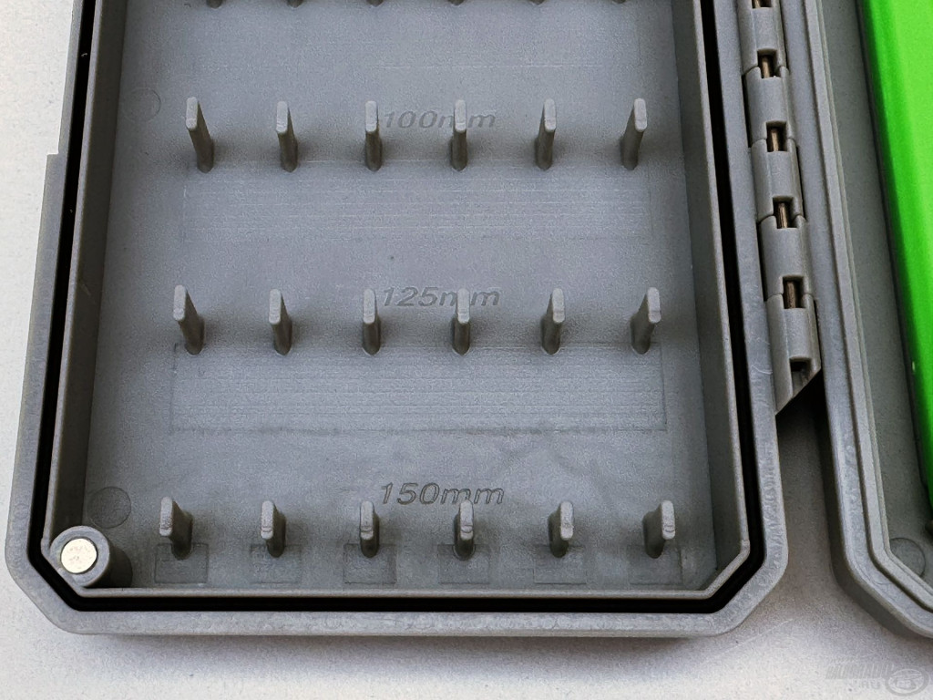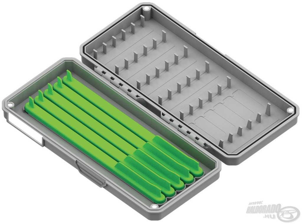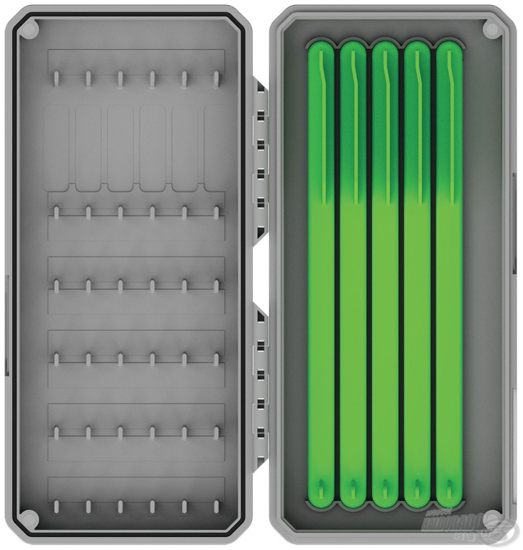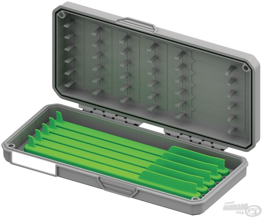 Wnętrze pudełka oferuje dwustronne możliwości przechowywania: jedna strona jest wyposażona w klasyczny panel na przypony, odpowiedni do mocowania przyponów haczykowych o różnej długości. Po drugiej stronie znajduje się pięć wyjmowanych drabin, z których każda pozwala na precyzyjne i bezpieczne umieszczenie 8 szt. przyponów haczykowych o długości 16 cm. Magnetyczne zamknięcie z czterema silnymi magnesami zapewnia szczelne dopasowanie pudełka, dzięki czemu wilgoć i zanieczyszczenia nie dostają się do środka, chroniąc przypony przed rdzą i przedwczesnym uszkodzeniem.