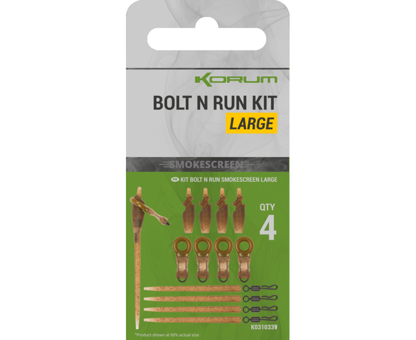 Korum Smokescreen Bolt N Run Kit Large to zaawansowany, maskujący zestaw końcowy, specjalnie zaprojektowany do tworzenia bezpiecznych, pół-stałych (semi-fixed) i nieplączących się zestawów. Seria Smokescreen to najbardziej innowacyjne rozwiązanie Korum, które zapewnia dyskretny wygląd na dnie jeziora, pomagając uniknąć podejrzliwości ryb, szczególnie w czystej wodzie lub w przypadku ostrożnych ryb.