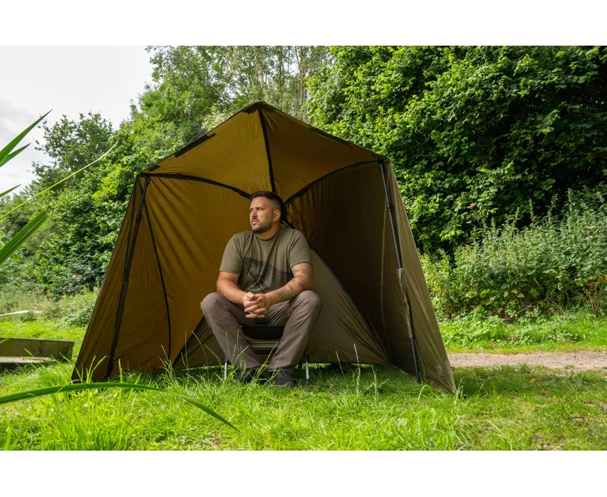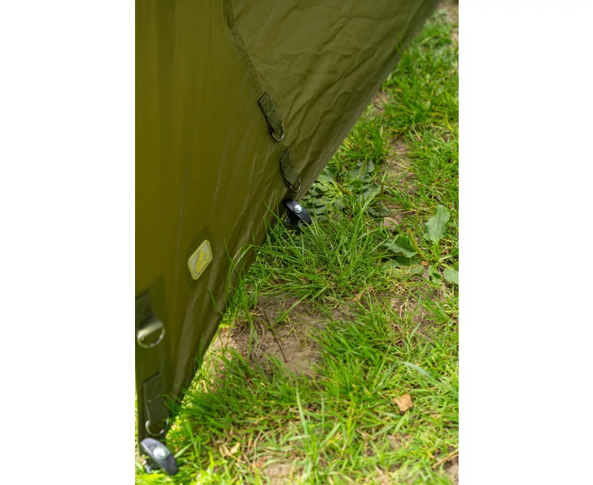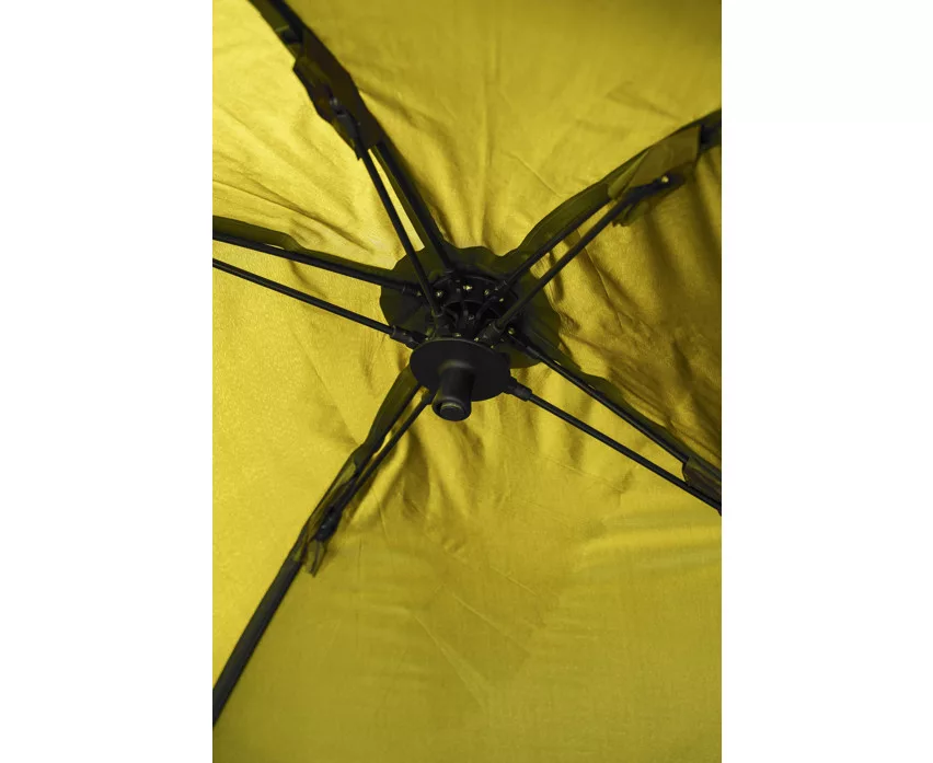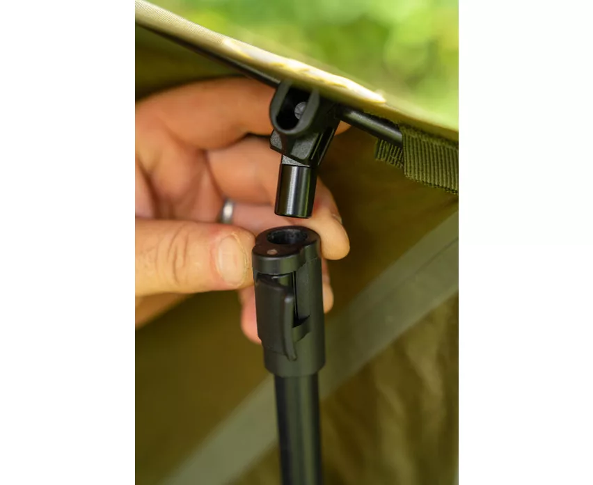 Krótka konstrukcja wewnętrznego systemu żeberkowego brolly zapewnia maksymalną przestrzeń nad głową, a jednocześnie montaż jest prosty i szybki – nie jest wymagana centralna tyczka. Dzięki dwóm dołączonym, szybkozłącznym sztycom sztormowym parasol można stabilnie przymocować do podłoża, zapewniając niezawodną ochronę nawet podczas wietrznej pogody. Wysokość namiotu można łatwo regulować za pomocą unikalnego systemu napinającego, dzięki czemu wędkarz może zawsze dostosować ustawienia do panujących warunków.