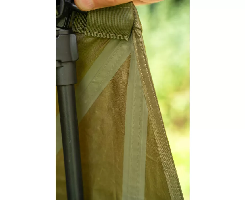 Płachta namiotu posiada wiele punktów mocowania, które umożliwiają napięte, stabilne ustawienie na różnych wysokościach. Jest to szczególnie przydatne, gdy warunki terenowe lub specyfika miejsca wędkowania są zróżnicowane. Materiał parasola to tkanina 150D PU Supa Lite, która jest wodoodporna, lekka i trwała, co czyni go niezawodnym towarzyszem nad wodą przez długi czas.