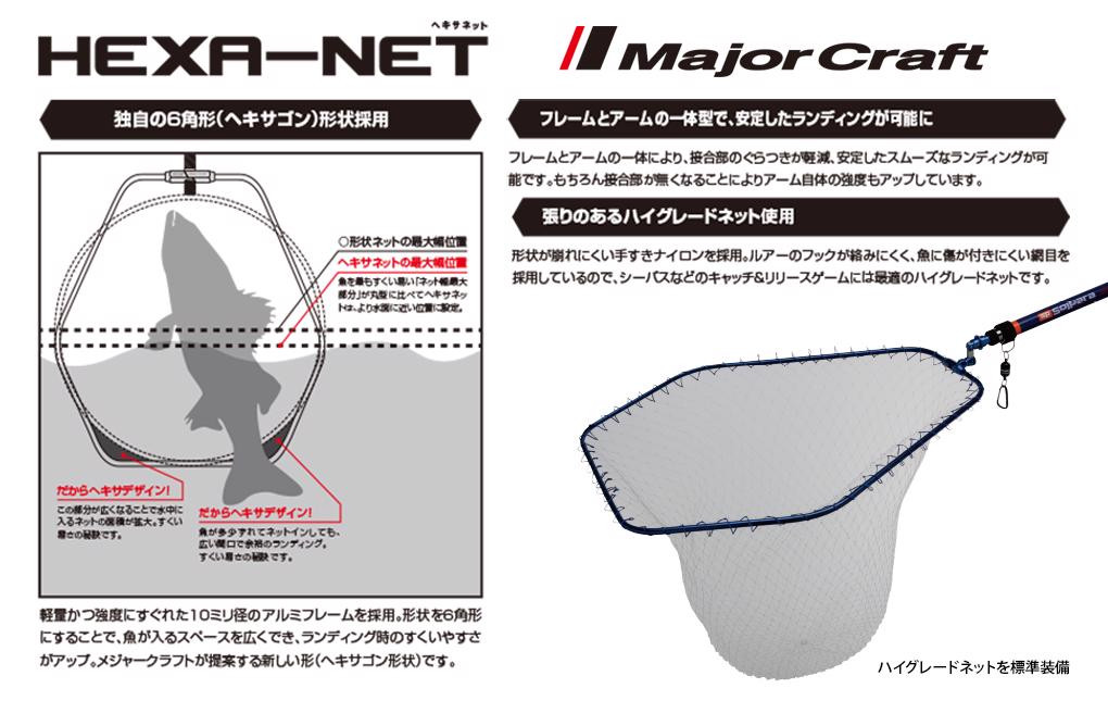Kompaktowa wersja głowicy podbieraka Major Craft HexaNet. Dzięki zastosowaniu gumowanej siatki, prawie nie rysuje ciała ryby, nawet jeśli ryba jest żywa. Szeroki sześciokątny kształt tworzy ramę podczas podbierania. Zalecany do lekkiego łowienia w słonej wodzie, np. lucjana czarnego i w trudnych, skalistych warunkach.