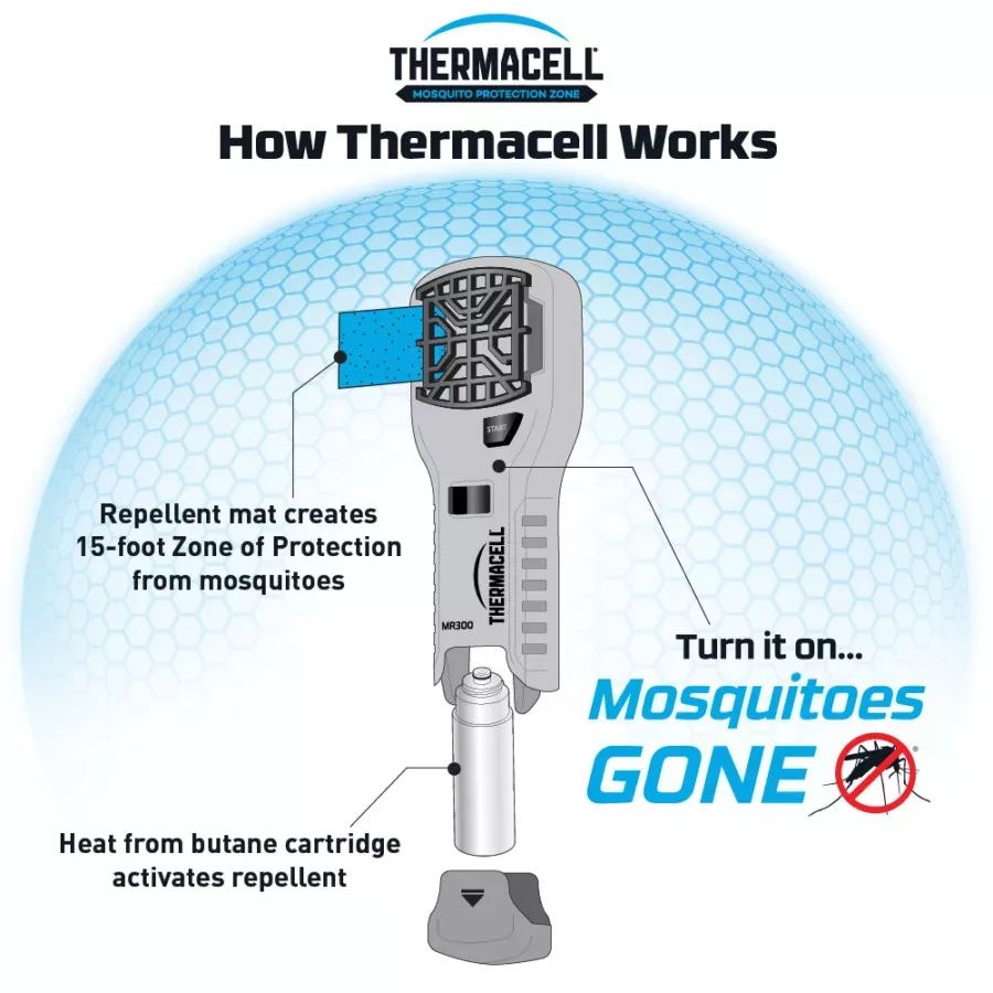 Thermacell MR-300L to przenośny odstraszacz komarów, łatwy w użyciu, zapewniający wielogodzinną, bezzapachową ochronę przed komarami na obszarze do 21 metrów kwadratowych.