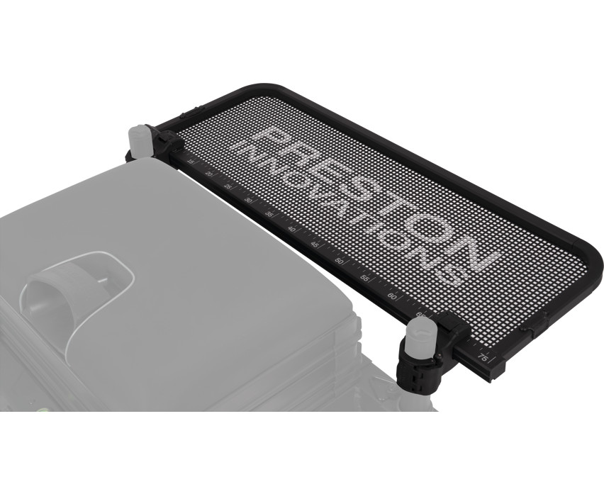Spód tacy wykonany jest z perforowanej blachy Ventamesh, która zapewnia odpowiednią wentylację wokół przynęt i zanęt, szczególnie w upalne dni. Działa również jako efektywny system odprowadzania wody, dzięki czemu nie musisz martwić się o zamoczenie sprzętu w deszczowe dni. Przesuwne przeguby mocujące umożliwiają szybkie i stabilne dopasowanie, a kompatybilność z osłoną zapewnia dodatkową ochronę w słoneczne dni.