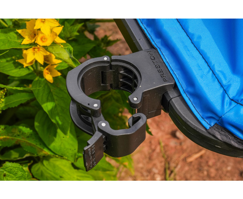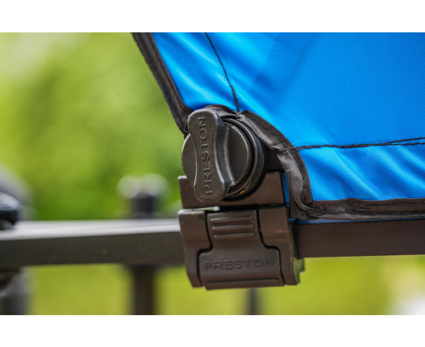 Spód tacki wykonany jest z perforowanej blachy Ventamesh, która zapewnia odpowiednią wentylację wokół przynęt i zanęt, szczególnie w czasie upałów. Działa również jako skuteczny system odprowadzania wody, dzięki czemu nie trzeba martwić się o zamoknięcie sprzętu w deszczowe dni. Jasna, odpinana osłona przeciwsłoneczna pomaga odbijać ciepło słoneczne, jednocześnie chroniąc przed deszczem i wiatrem. Przesuwny, bezpieczny przegub mocujący umożliwia szybkie i stabilne mocowanie, a beznożna konstrukcja ułatwia pozycjonowanie nawet w ciasnych miejscach.