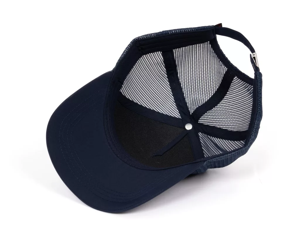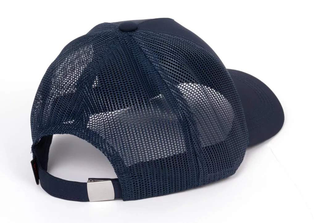 Przednia część czapki wykonana jest z mocnego, dobrze trzymającego kształt materiału tekstylnego, natomiast tylny panel składa się z przewiewnej siateczki. Metalowy pasek z klamrą umożliwia precyzyjną regulację rozmiaru, dzięki czemu czapka jest uniwersalna i może być szeroko stosowana.