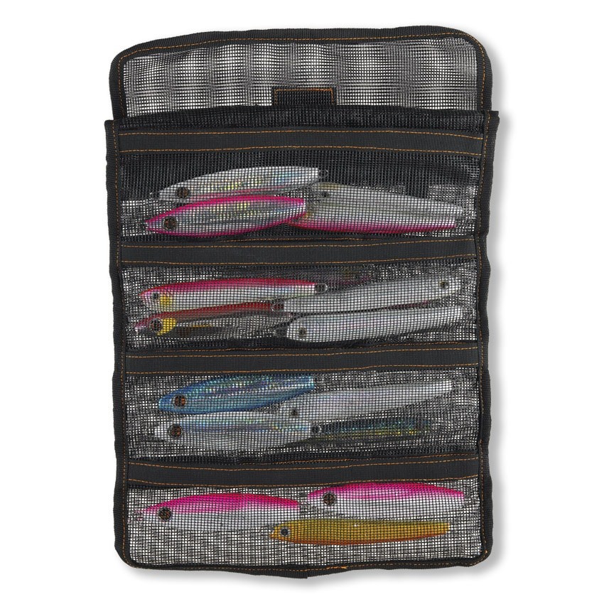 Model posiada 9 siatkowych przegród, których rozmiar jest kompatybilny z większością przynęt sztucznych dostępnych na rynku. Kieszenie są mocowane na rzepy po obu stronach, co pozwala na wygodne ułożenie przynęt. Praktyczność SAKURA JIG ROLL BINDER wynika z możliwości zwinięcia, dzięki czemu zajmuje mało miejsca i co ważne, pozwala na bezpieczne przechowywanie przynęt. W torbie można z łatwością umieścić nawet dwadzieścia jigów lub innych rodzajów przynęt sztucznych.