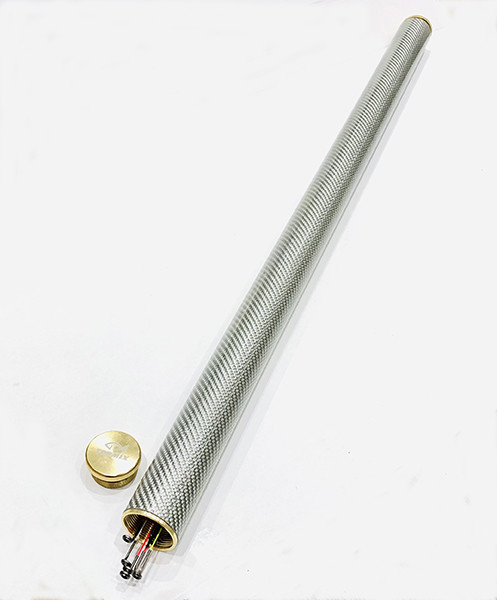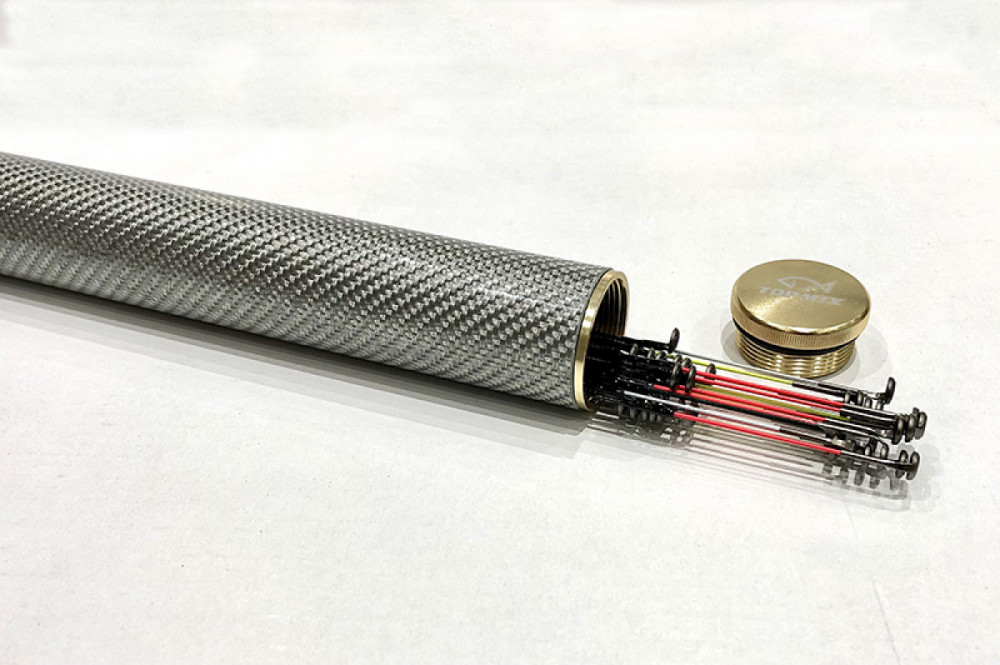 Carbonowy futerał na szczytówki feeder. Unikalna, elegancka konstrukcja, służąca do bezpiecznego przechowywania szczytówek wędek feeder, wykonana z wytrzymałego, wielowarstwowego materiału węglowego rurka z gwintowanymi, metalowymi zaślepkami na obu końcach.