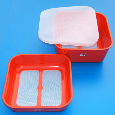 Wysokiej jakości pudełka na przynęty o wymiarach 16x16 cm z sitkowym dnem, z pokrywką, do przechowywania białych robaków i dżdżownic. Na wewnętrznej ściance pudełek znajduje się skala objętości w litrach i pintach. Jest to niezbędne do kontroli limitów na zawodach. Przynęty mogą być bezpiecznie przechowywane w pudełkach nawet w letnie upały, nie uduszą się.