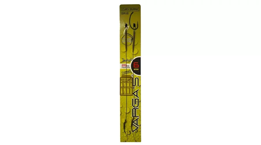 A Vargas Curv Shank SR.8 6 füles, szakállas, fonott előkötött horog olyan horgászok számára készült, akik nagytestű pontyokra tervezett, stabil és kontrollált működésű végszereléket keresnek. A VARGA’S SR8 Curv Shank Coated Rig egy prémium minőségű, bevonatos előke, amelyet kifejezetten a nagy halakkal folytatott, erőt próbáló fárasztásokhoz fejlesztettek. A Curv Shank horog formája természetes módon fordítja rá a hegyet a ponty alsó ajkára, így hatékony akadást biztosít még akkor is, amikor a hal óvatosan vizsgálja vagy „fújja” a csalit.